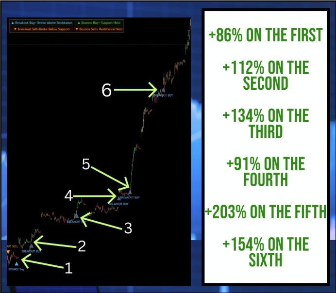 In fact, it hit not one, not two, not three, but SIX breakout trades in a row...